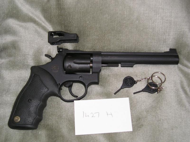 .22 Brand New Taurus Model 96, matt blued, with 6" barrel. Complete with rubber safety cover for rear adjustable sights. The gun also has the "Taurus Security System", which, when engaged prevents the functioning of the revolver. Already restricted to two shot. |